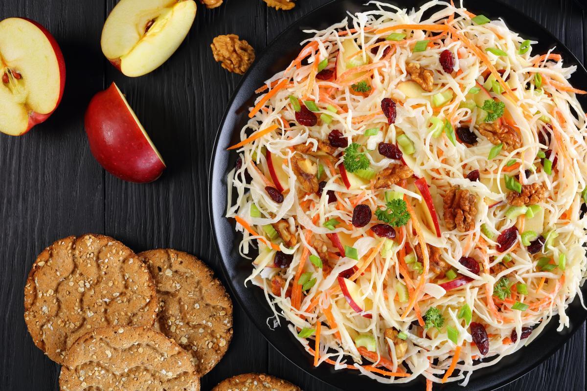 Настържете зелето на тънко, след което настържете морковите и ябълката на едро ренде. Добавете нарязан зелен лук и семена от нар. Смесете съставките за дресинга, залейте салатата и разбъркайте.